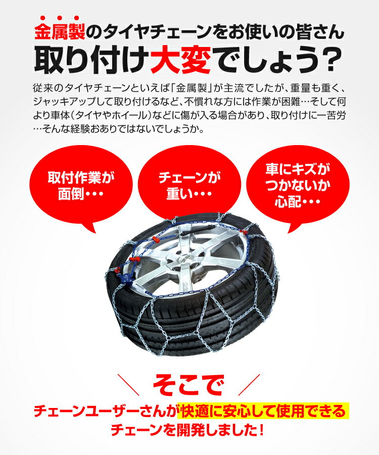 【タイヤ2本分】 タイヤチェーン 非金属 205/60R16 195/65R15 215/65R16 215/55R17 225/60R18 タイヤ チェーン 簡単 車 軽自動車 普通車 軽トラ 雪 滑り止め スノーチェーン 冬用 冬 雪道 凍結 スリップ 防止 悪路 対策 ジャッキ 不要 セット