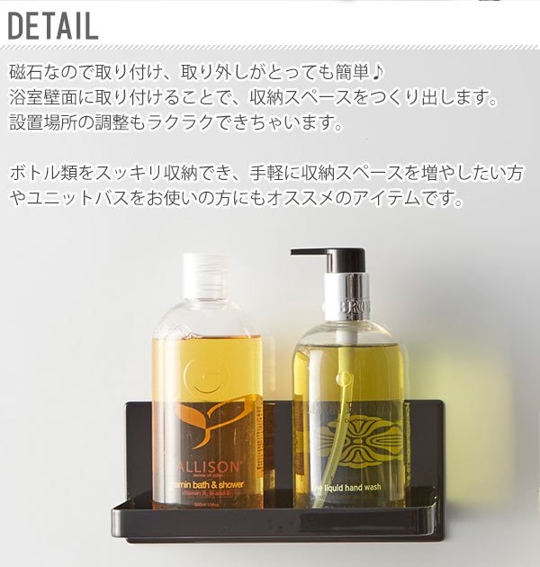 シャンプーやボディソープなどのボトル類をスッキリ収納できるスタイリッシュで便利なマグネットラックです。