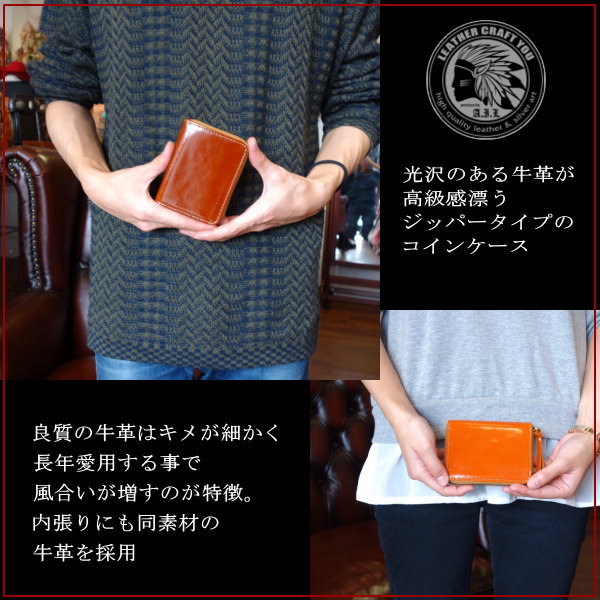 商品説明 レザーの本場ヨーロッパにてなめし加工されたカウレザーを使ったジッパータイプのコインケース。