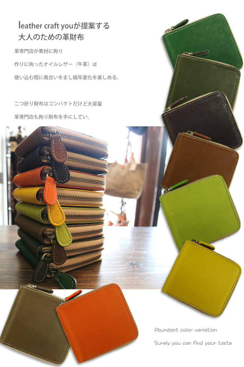 柔らかオイルレザーの二つ折りファスナー財布 商品説明・EXPLANATION キメが細かく柔らかな牛革を使い1点ずつハンドメイドで仕上げたファスナータイプの二つ折り財布。
